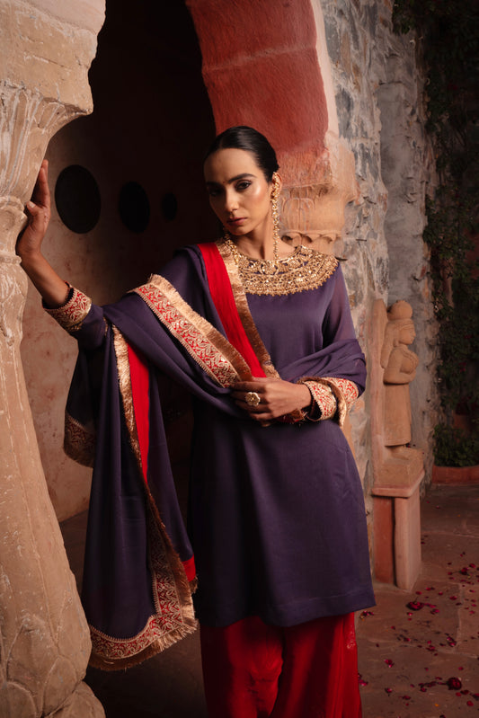 DEEP PURPLE & RED HAND EMBROIDERED KURTA SET