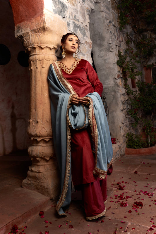 DEEP MAROON VELVET HAND EMBROIDERED KURTA SET