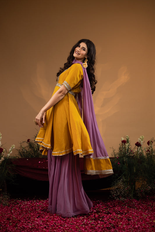 Deep Lilac and Mustard Asymmetrical Anarkali Sharara Set