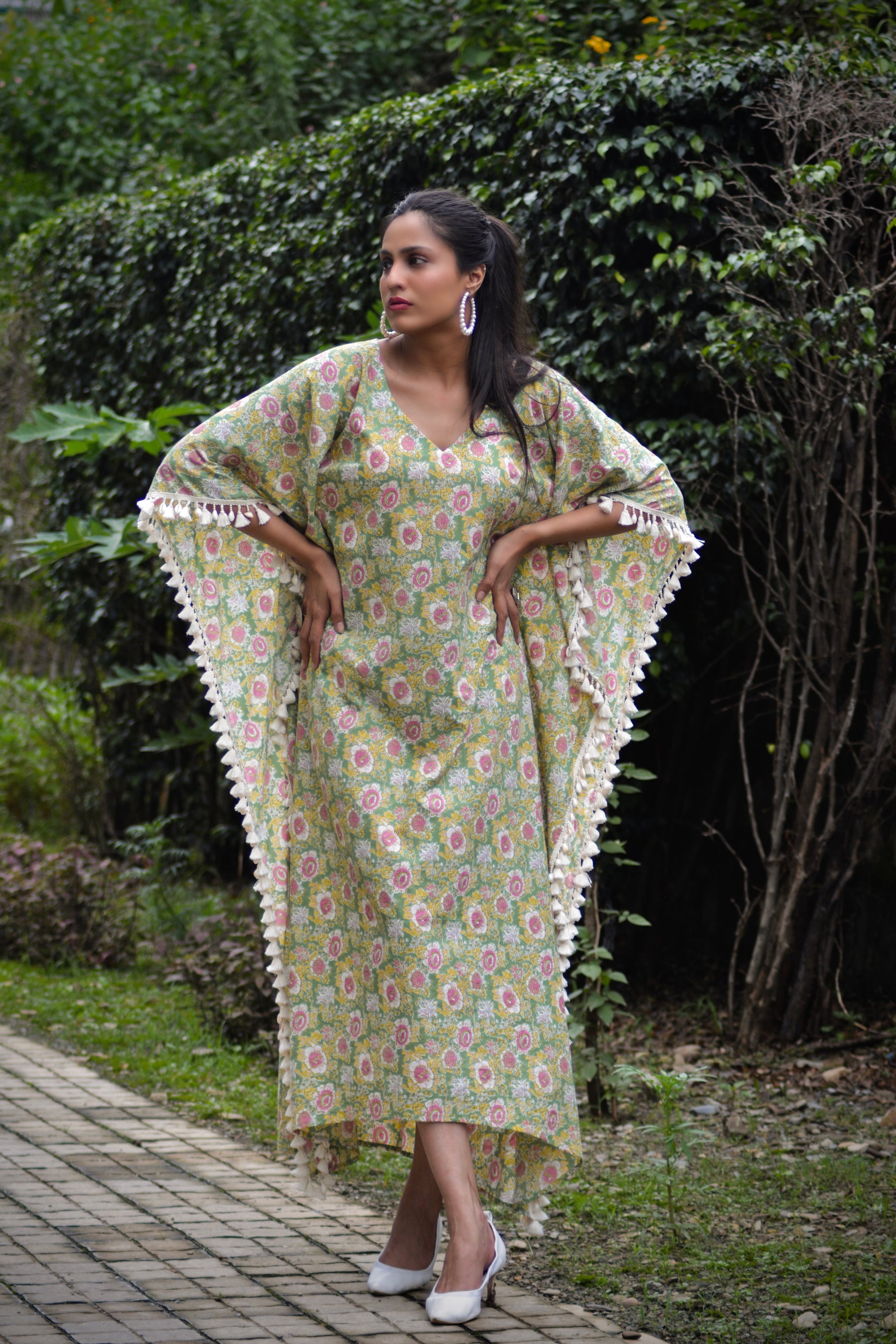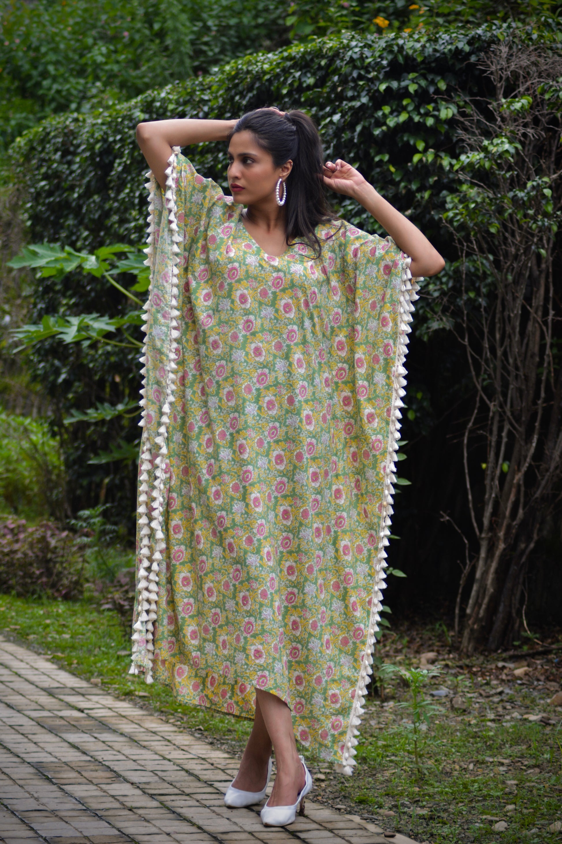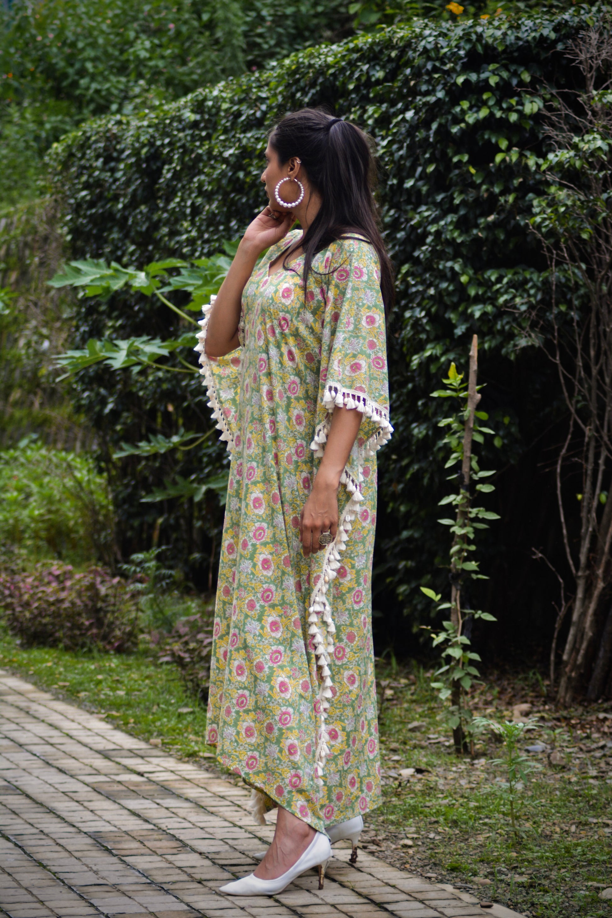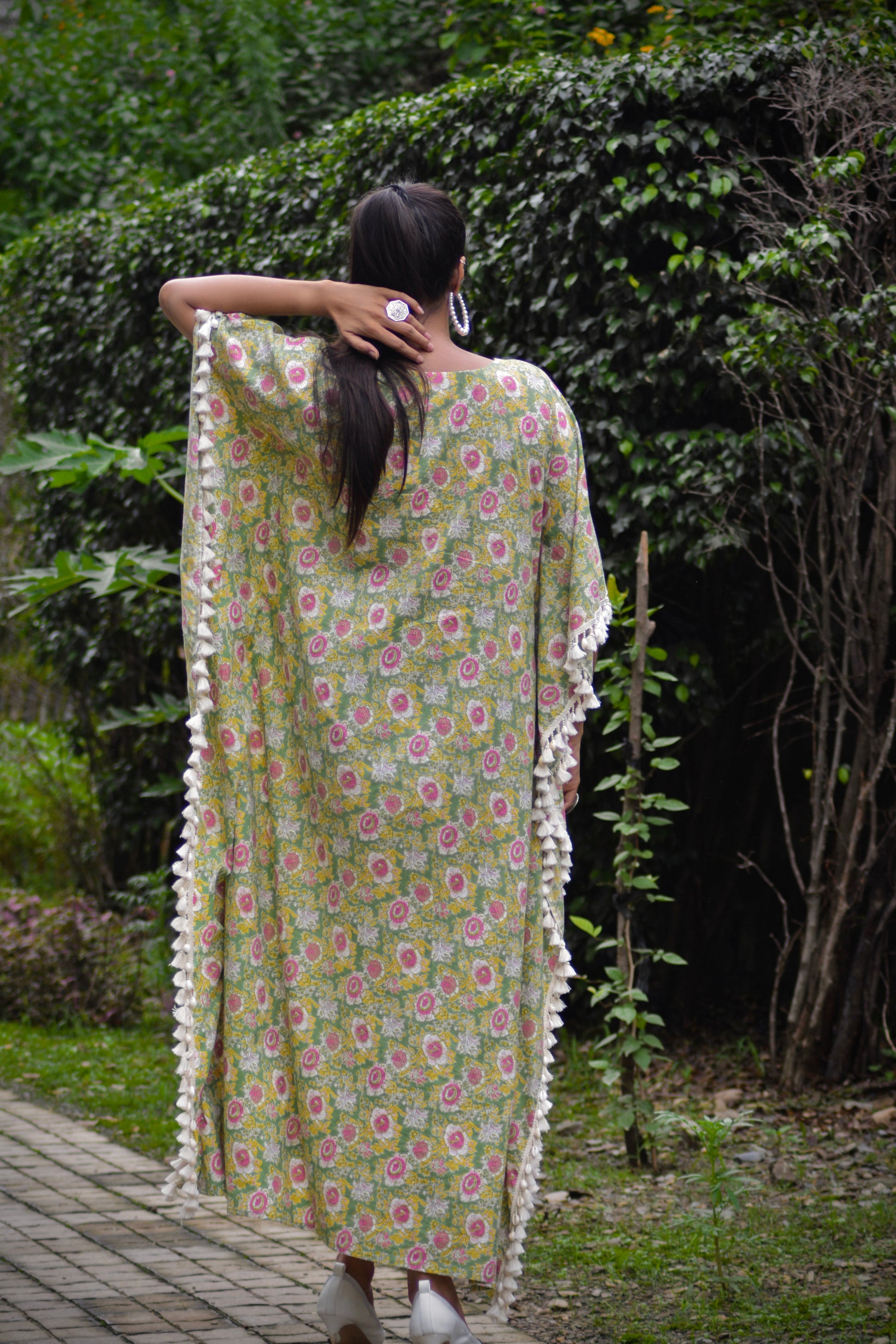 Refresh your look with our “Bageecha Kaftan” in green, pink, and yellow floral print in lightweight cotton. Its vibrant hues and fine tassels, creating a lively and chic outfit that's perfect for casual and festive gatherings.