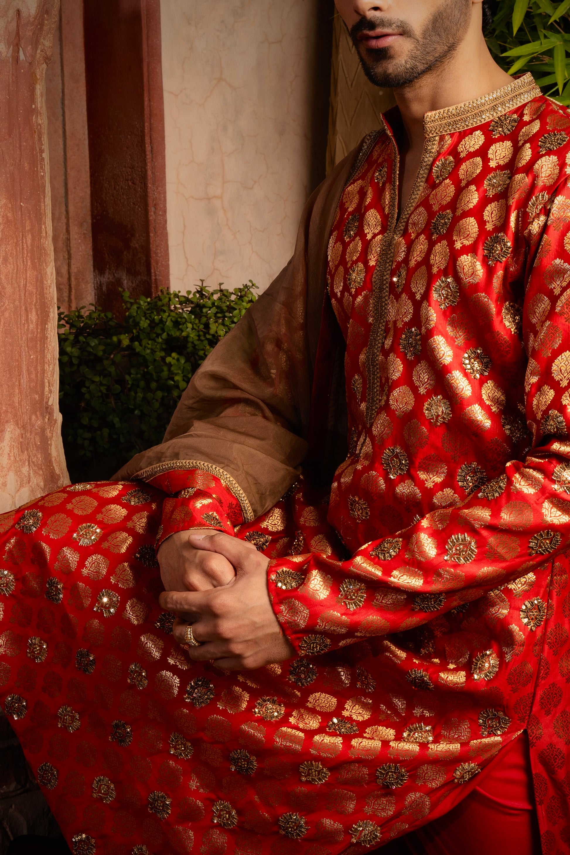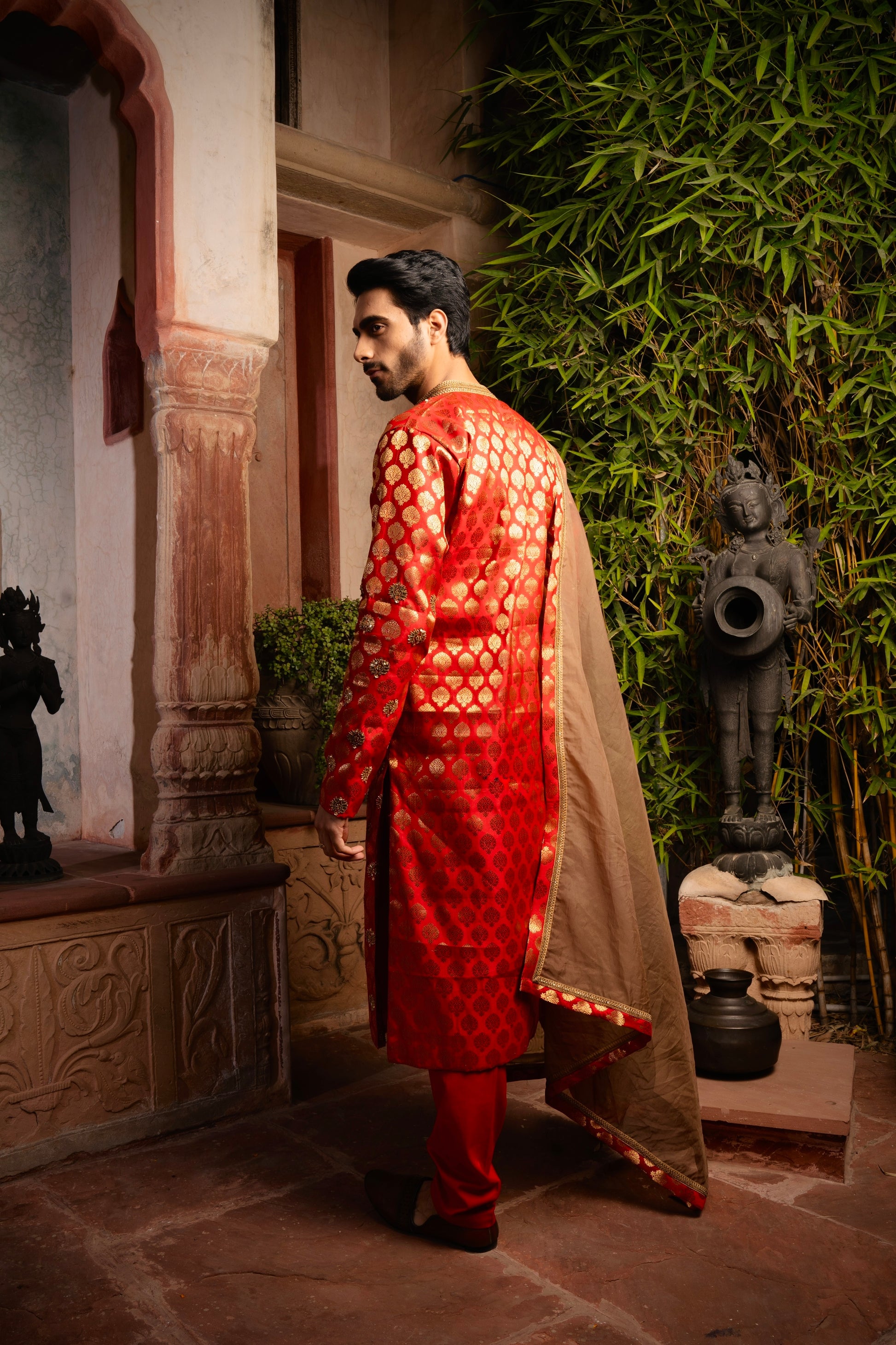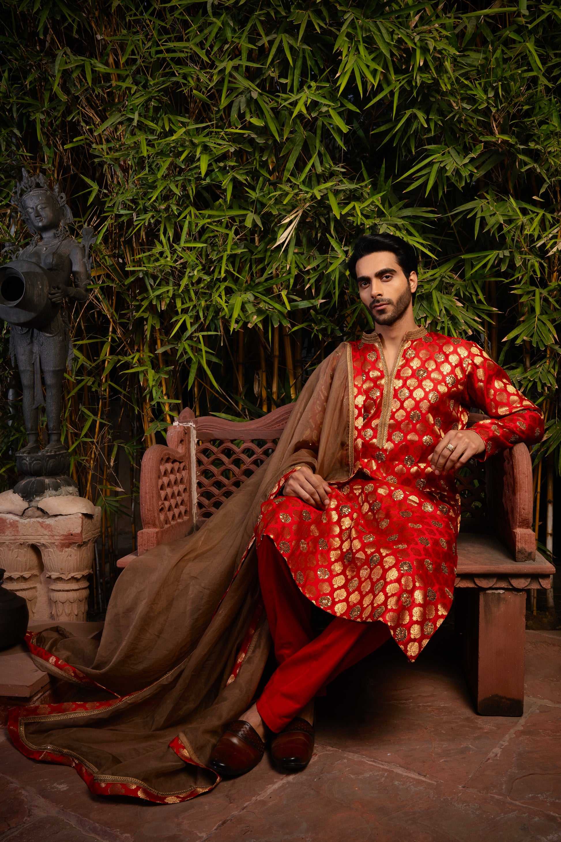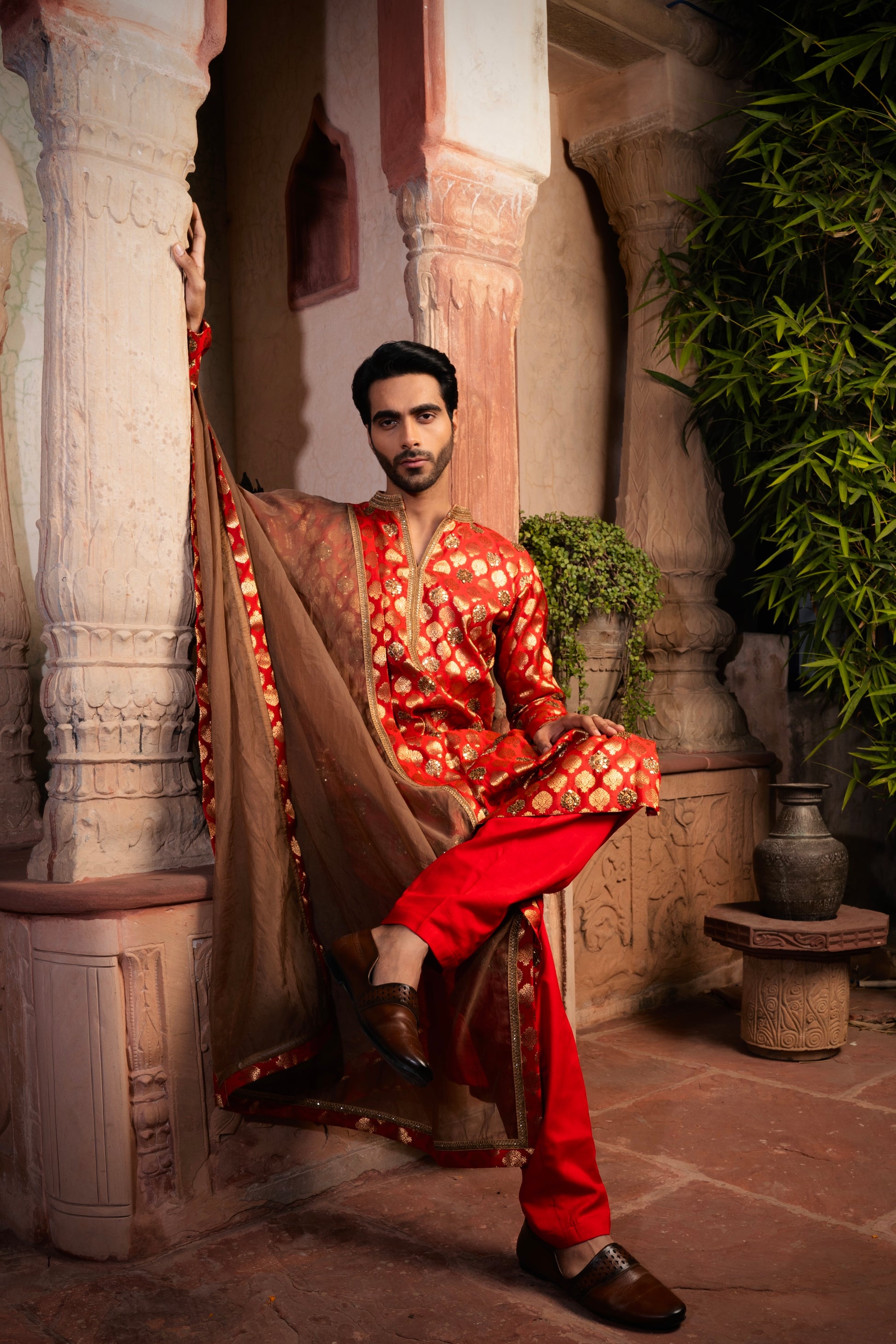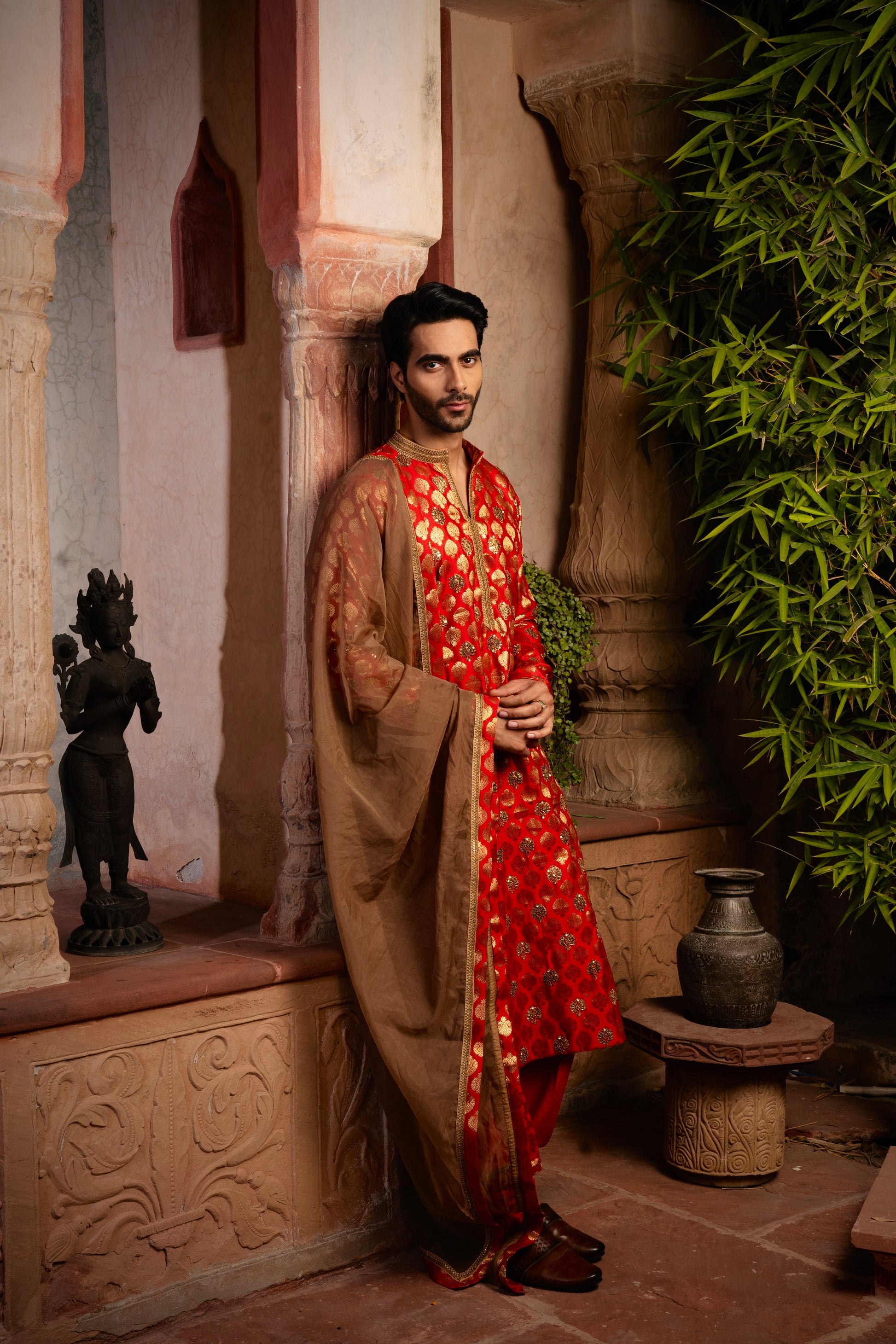 This striking men’s ensemble showcases a red Banarasi handwork kurta, intricately crafted to highlight the richness of traditional artistry.