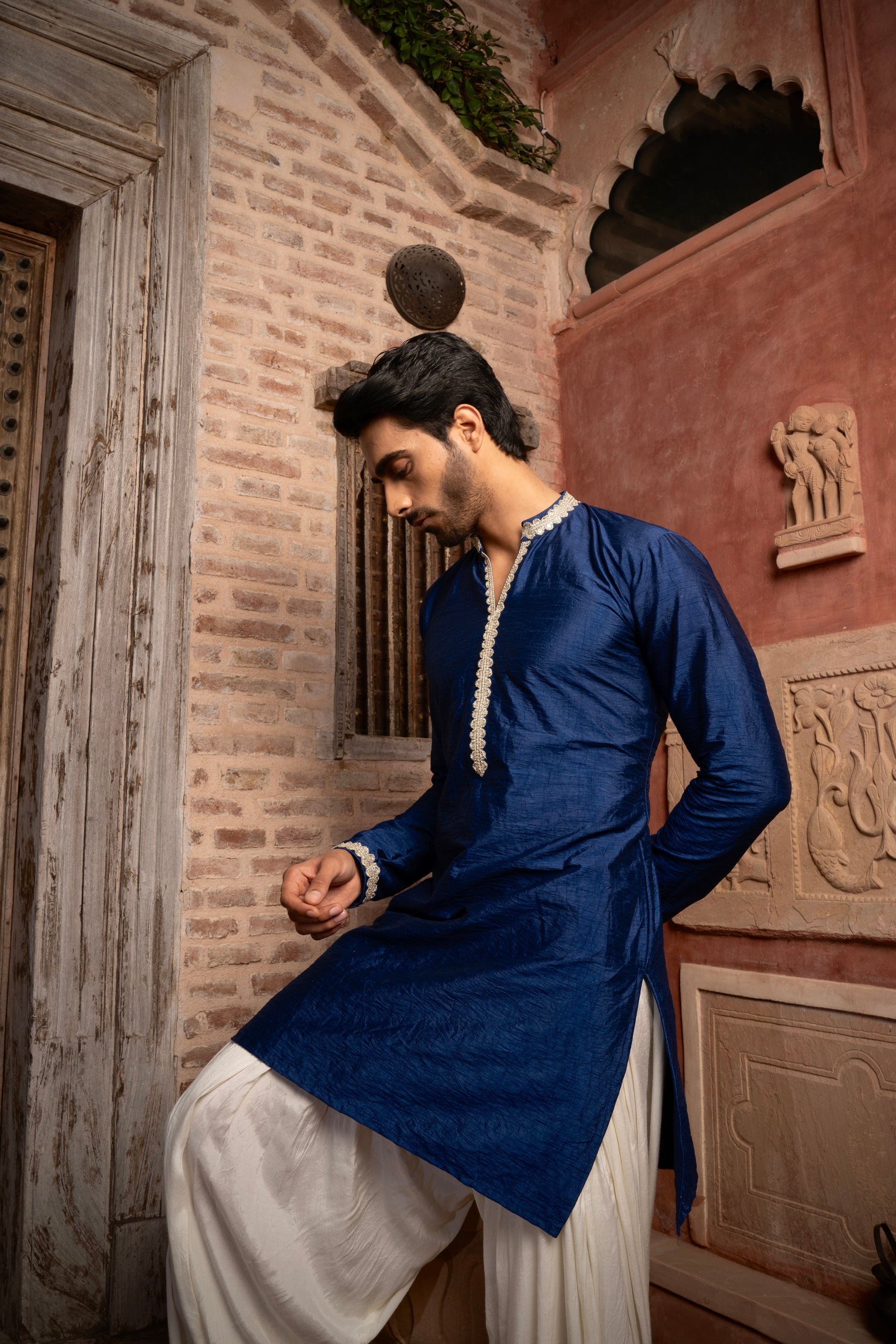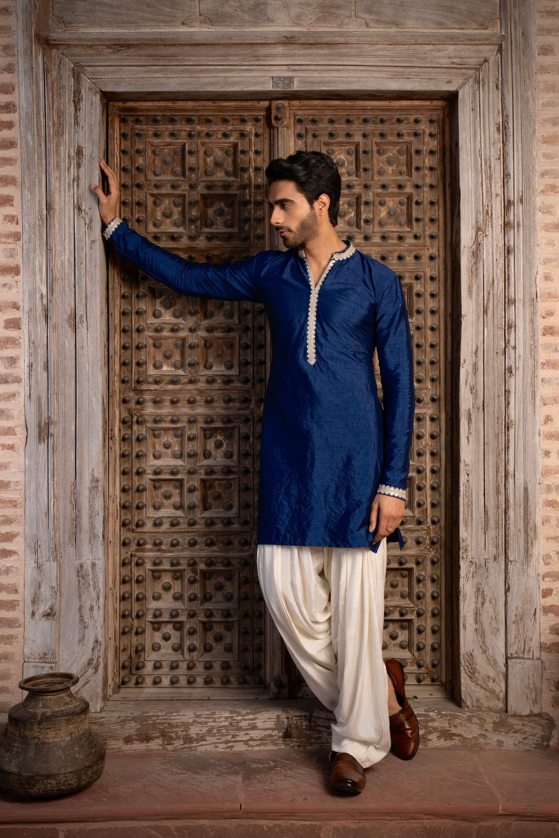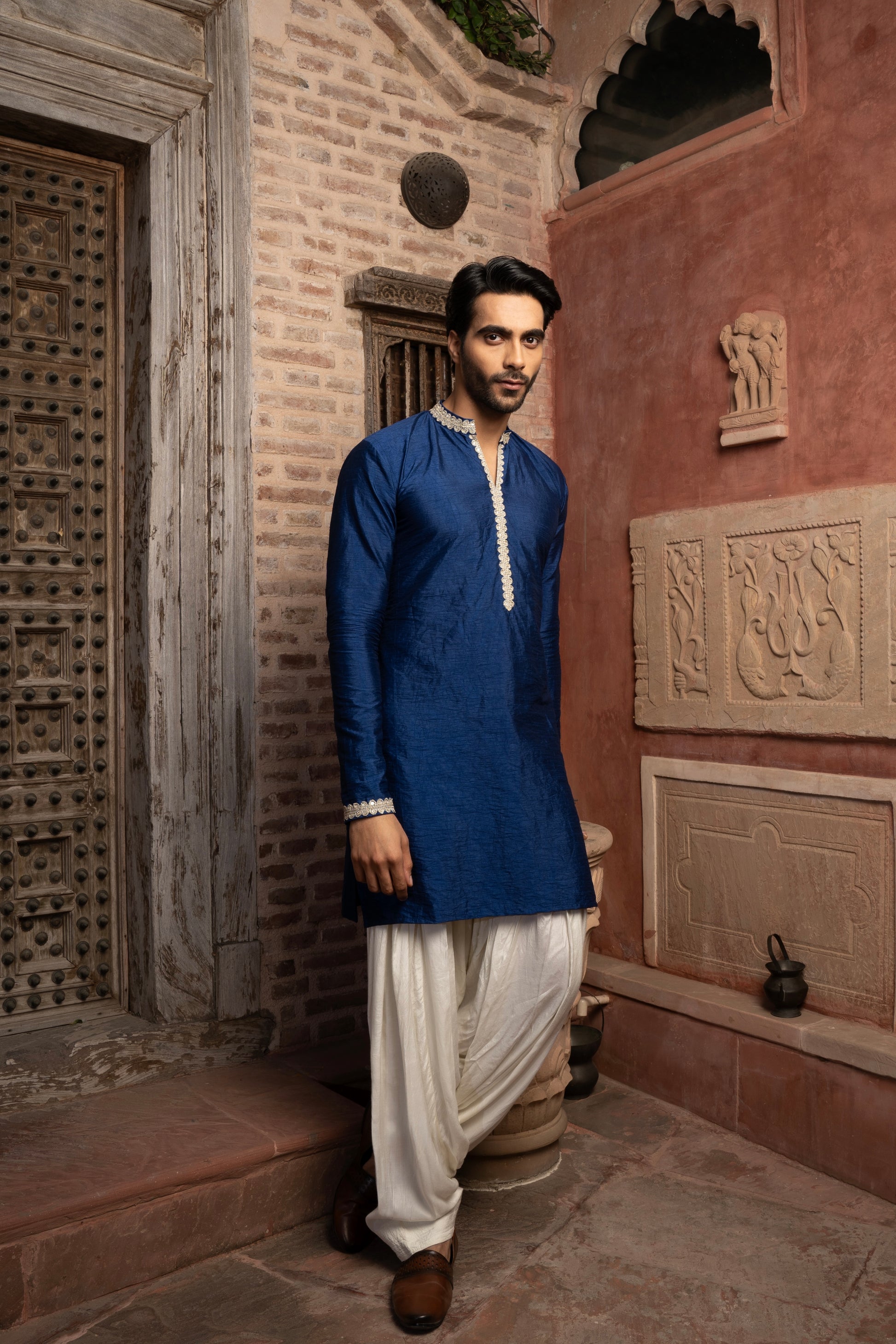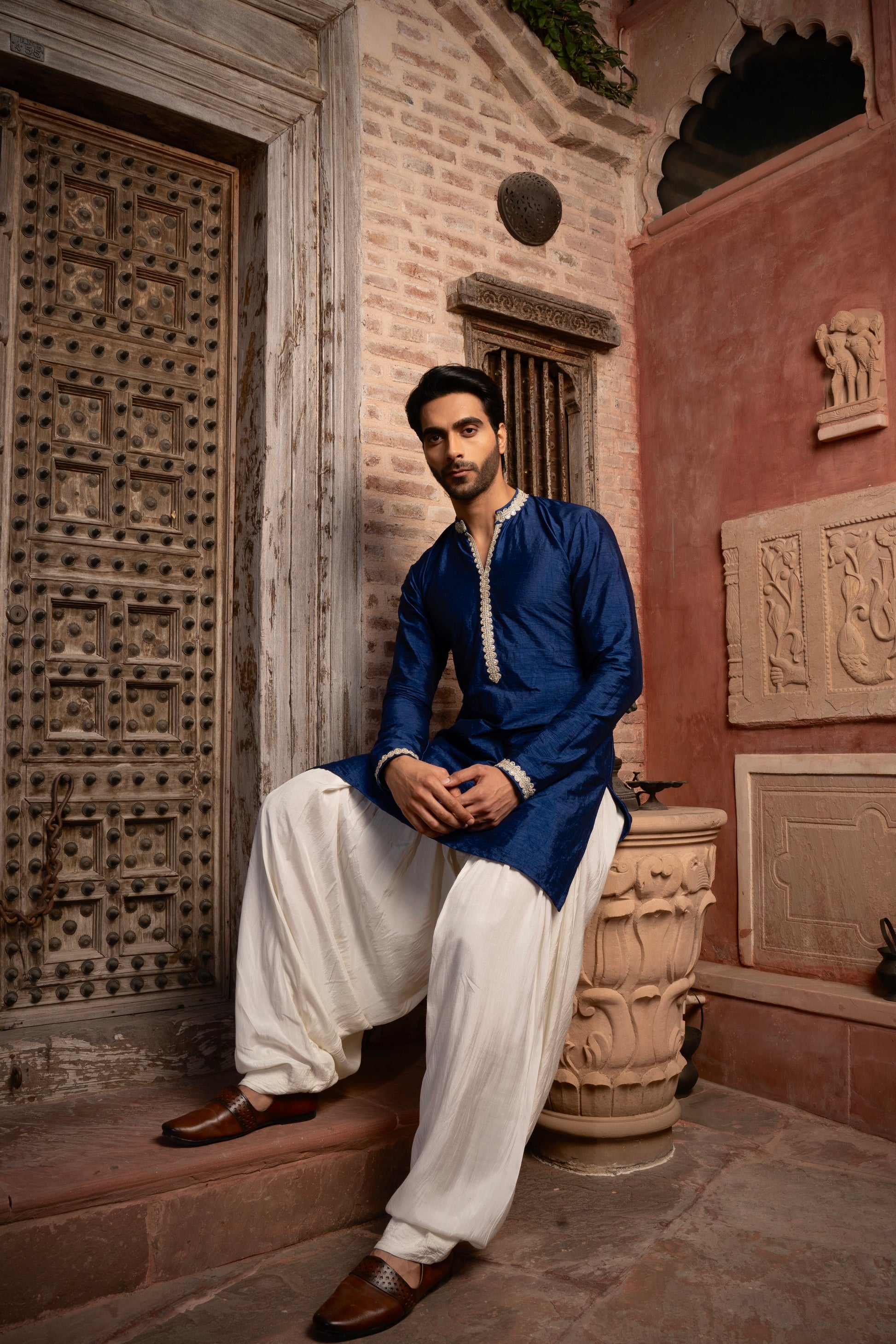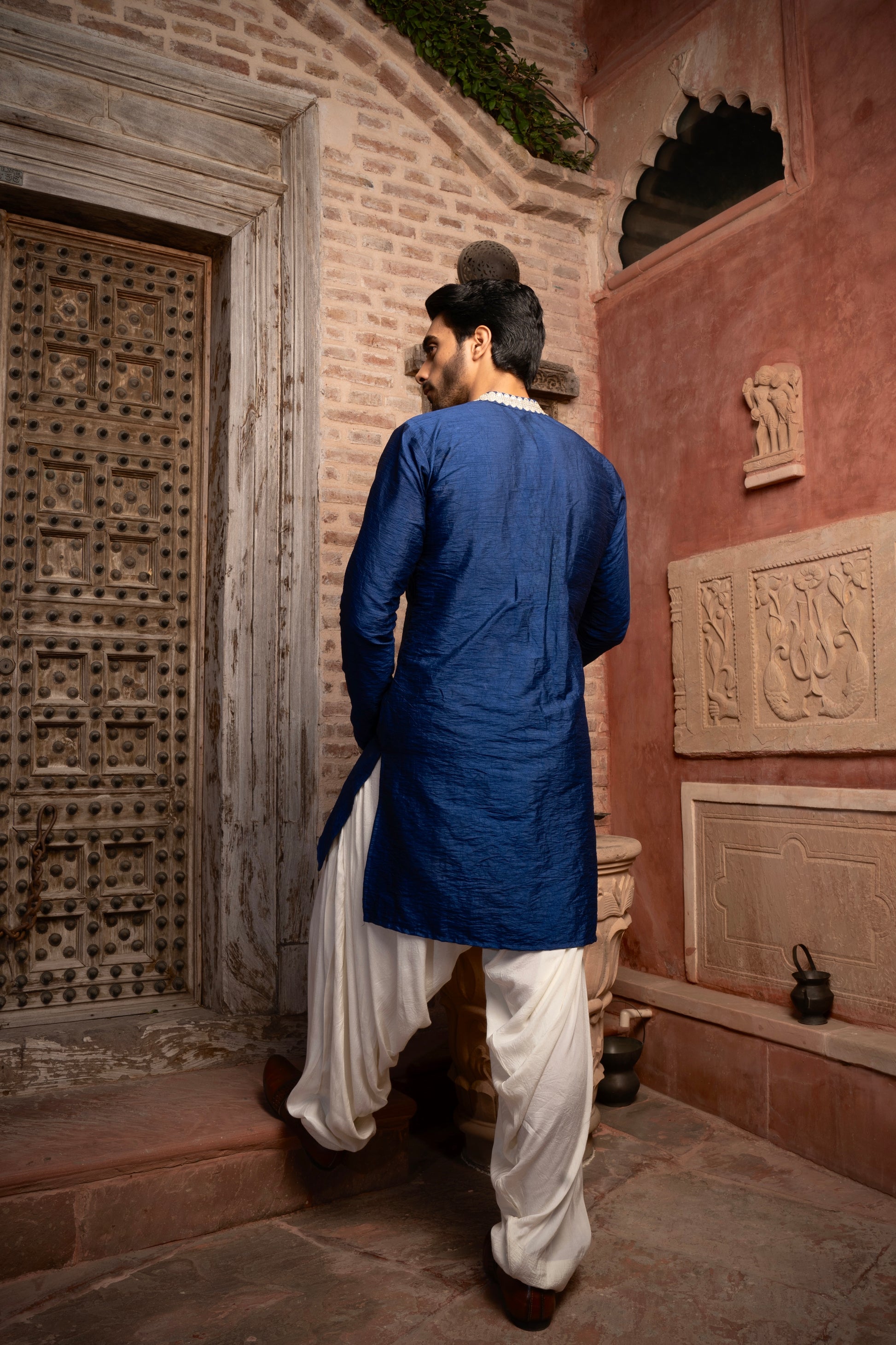 This refined men’s ensemble features a royal blue silk kurta adorned with delicate soft silver embellishments, exuding timeless elegance and a regal aura.
