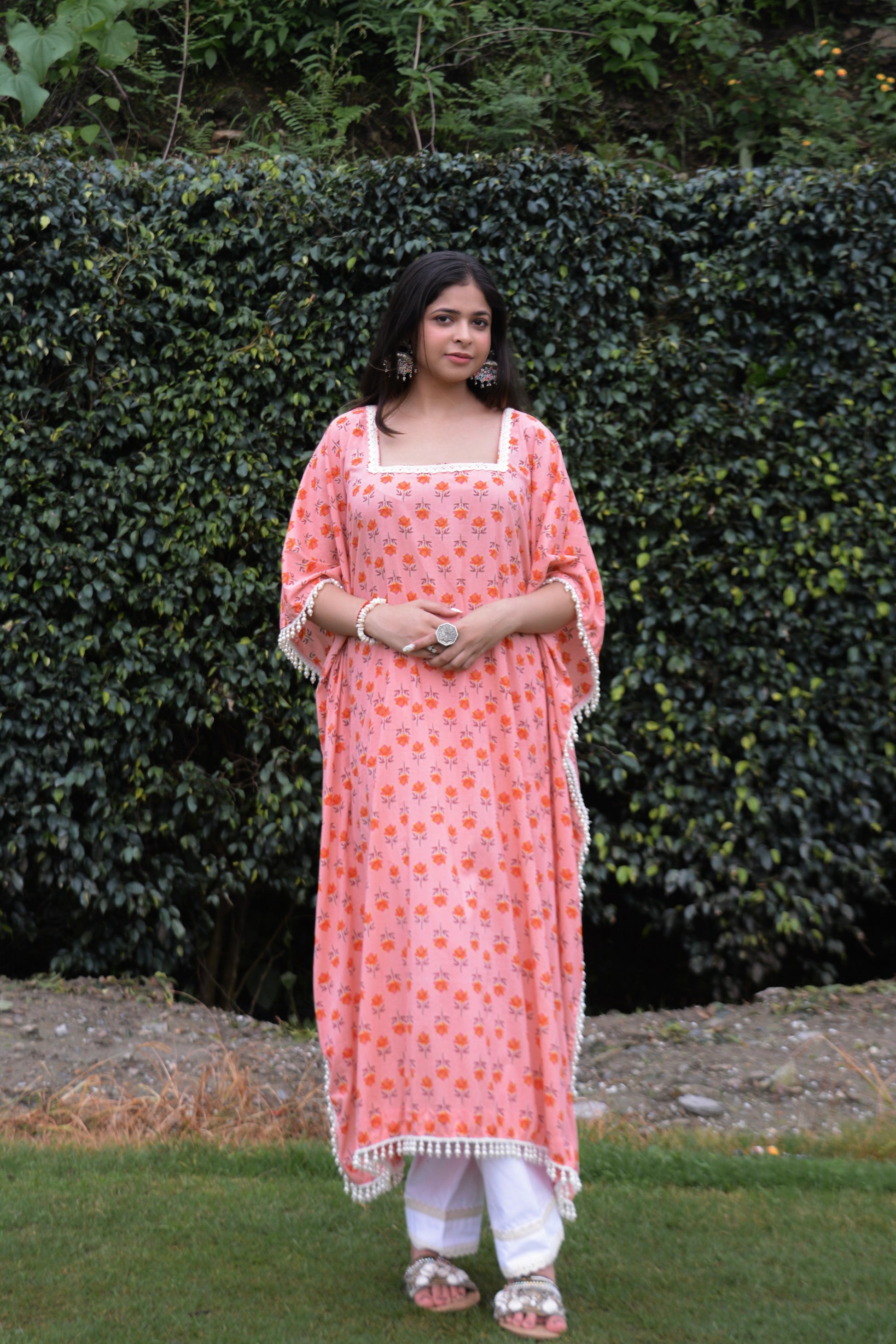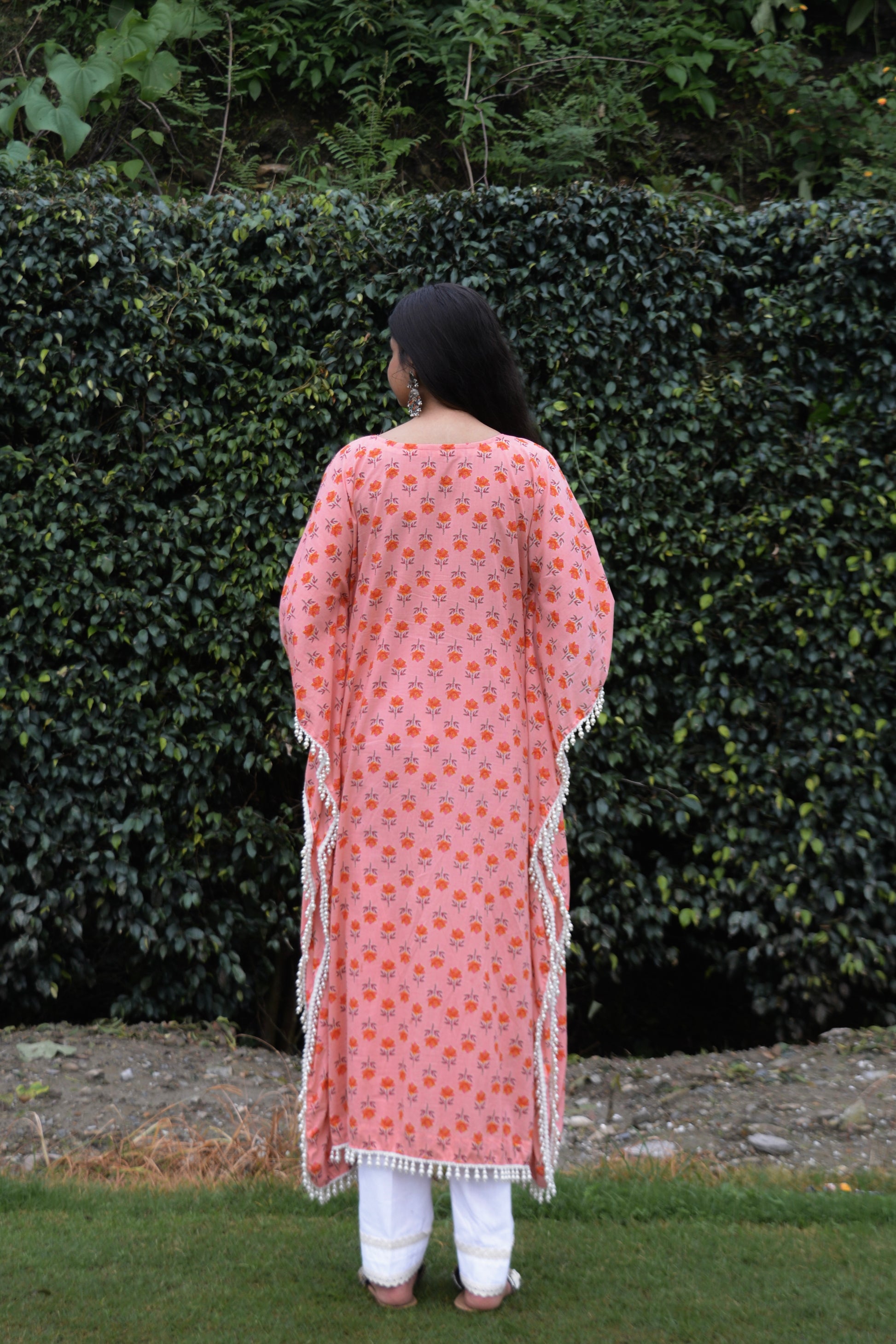 The ‘Sumona Kaftan set’ features a peach pink cotton kaftan adorned with floral motifs and delicate hanging pearl embellishments. Paired with contrast white pants, this set combines elegance and comfort, offering a stylish option for both casual and festive occasions. Perfect for a touch of sophistication and charm.