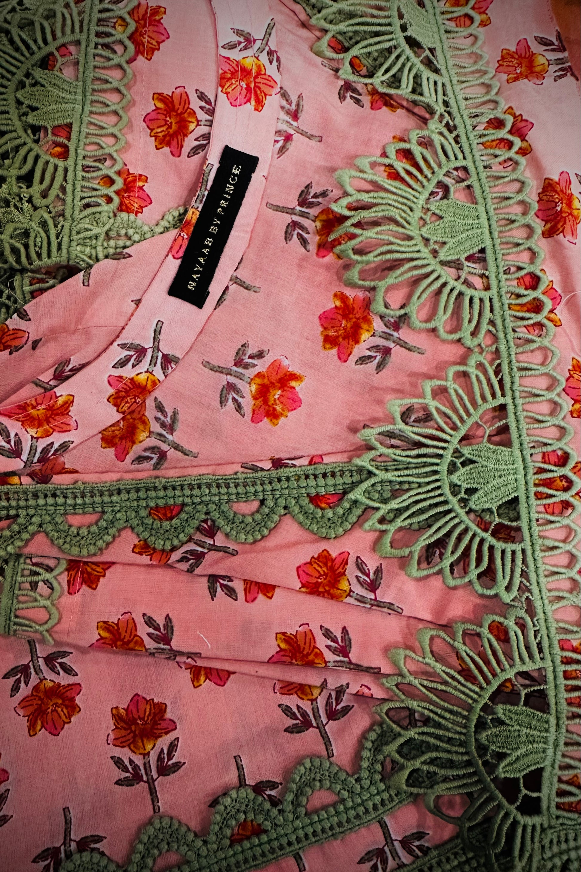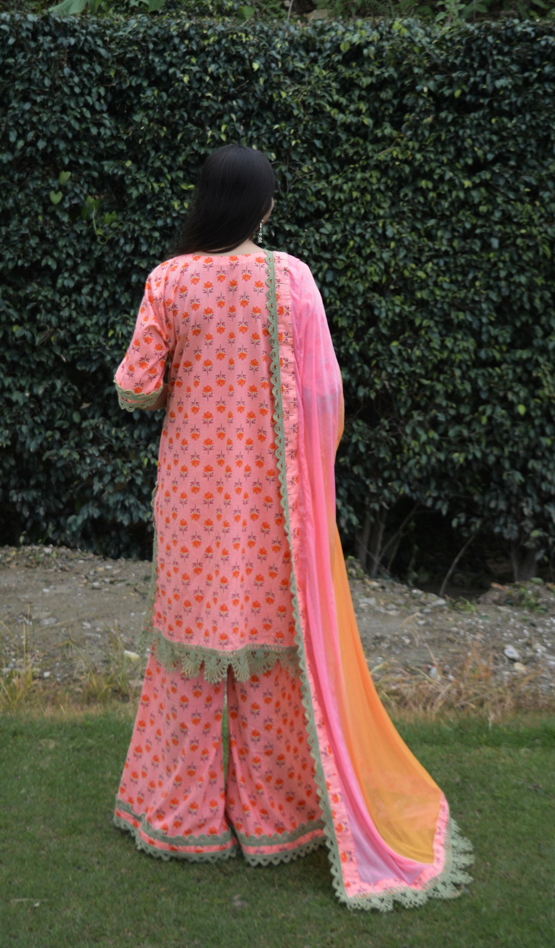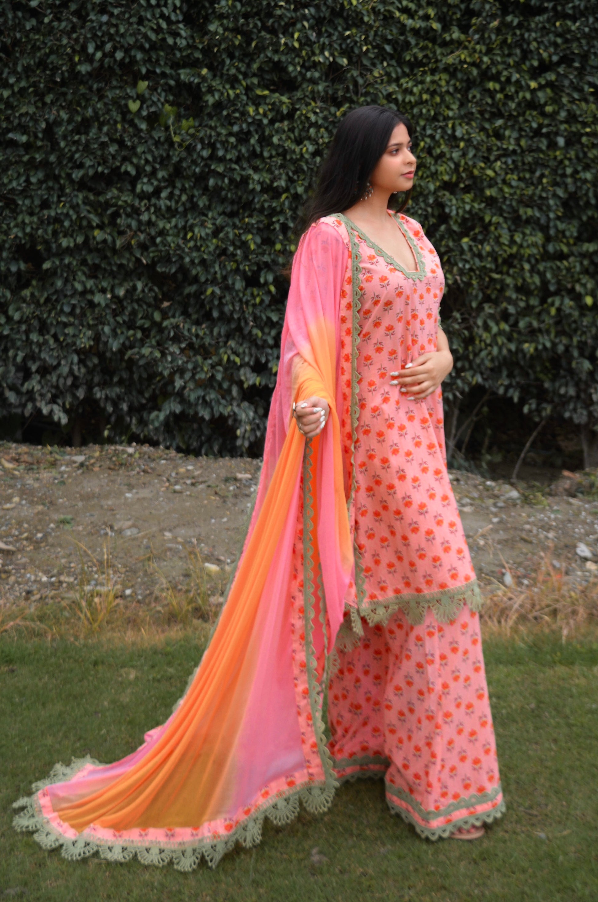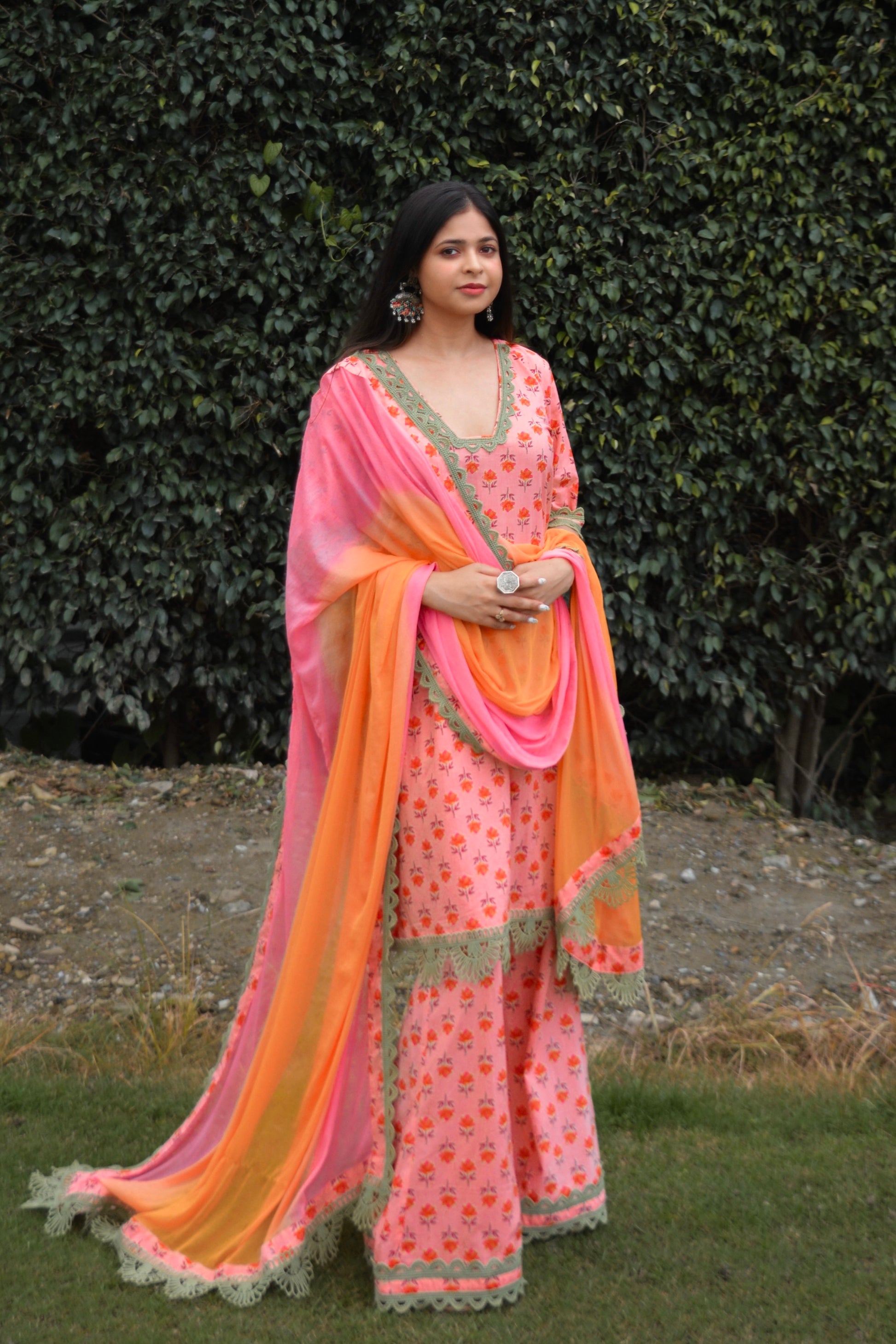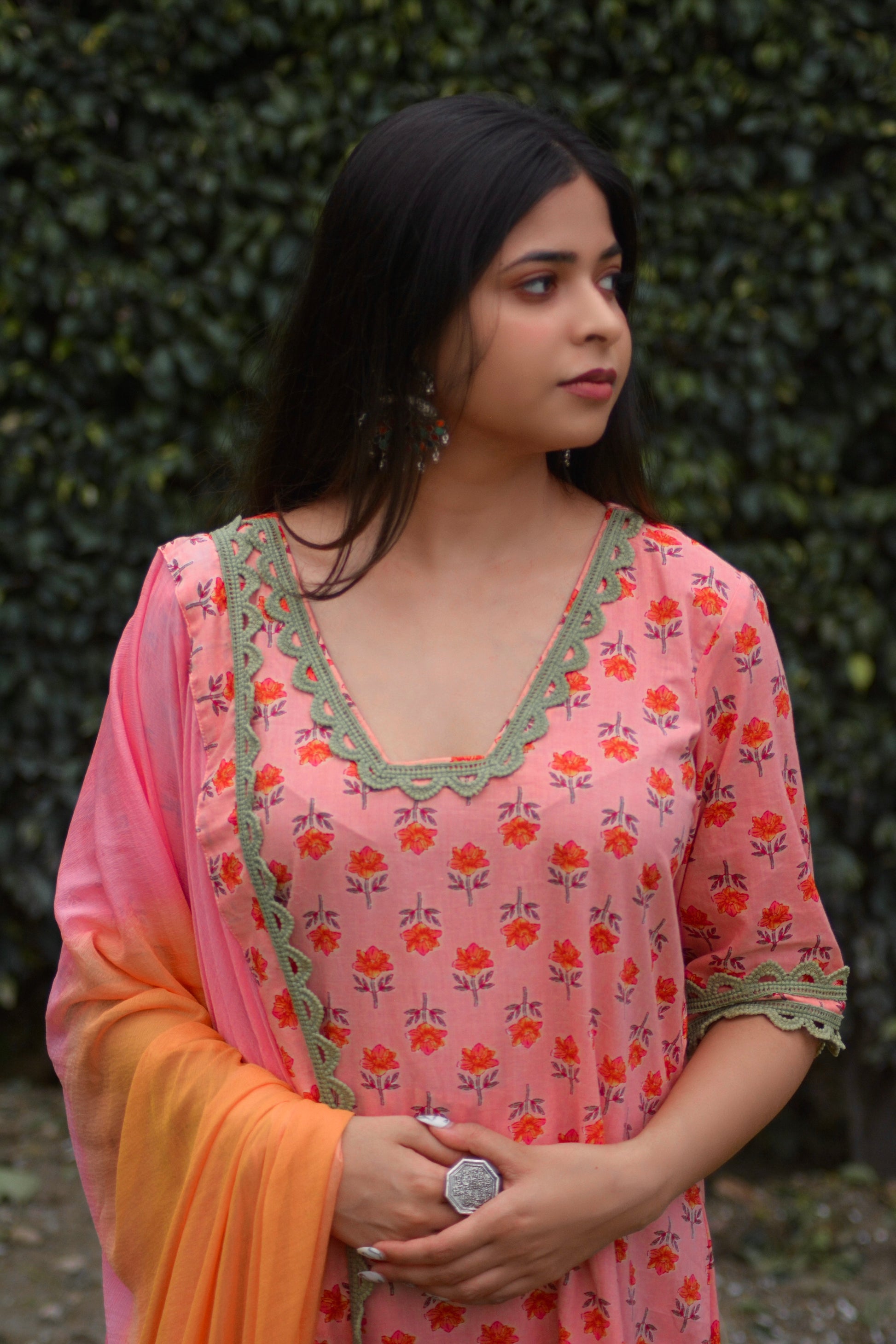 The “Sumona Kurta set” in soft peach pink showcases elegant floral prints and contrast green lace embellishments. Complete with a matching palazzo and an ombre dupatta, this set blends grace with contemporary style, making it ideal for both casual and festive events.