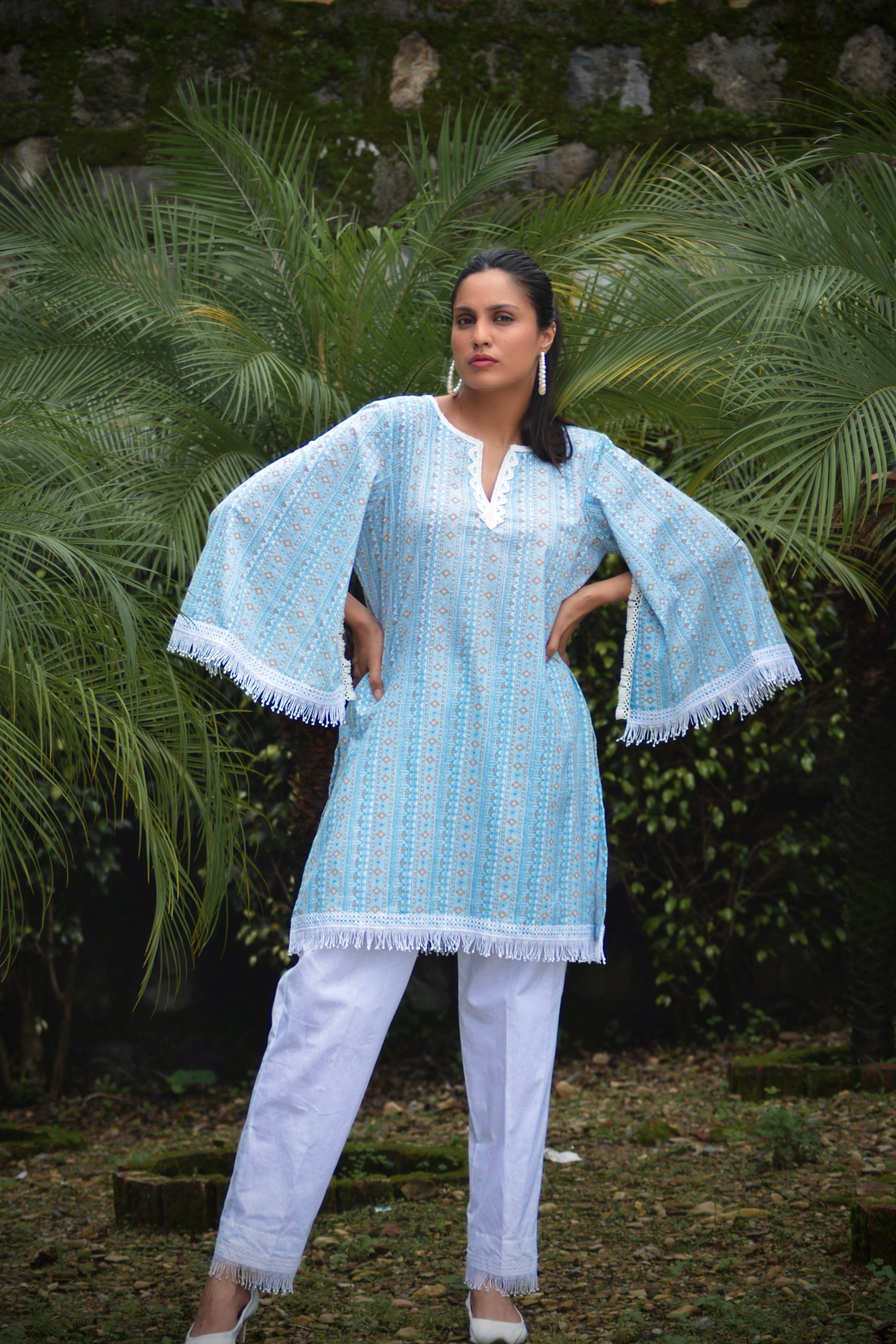 Elevate your style with “Zeenat” short blue and bohemian printed kurta with in lightweight cotton. Paired beautifully with the crisp white pants, creating a lively and chic outfit that's perfect for casual and formal gatherings.